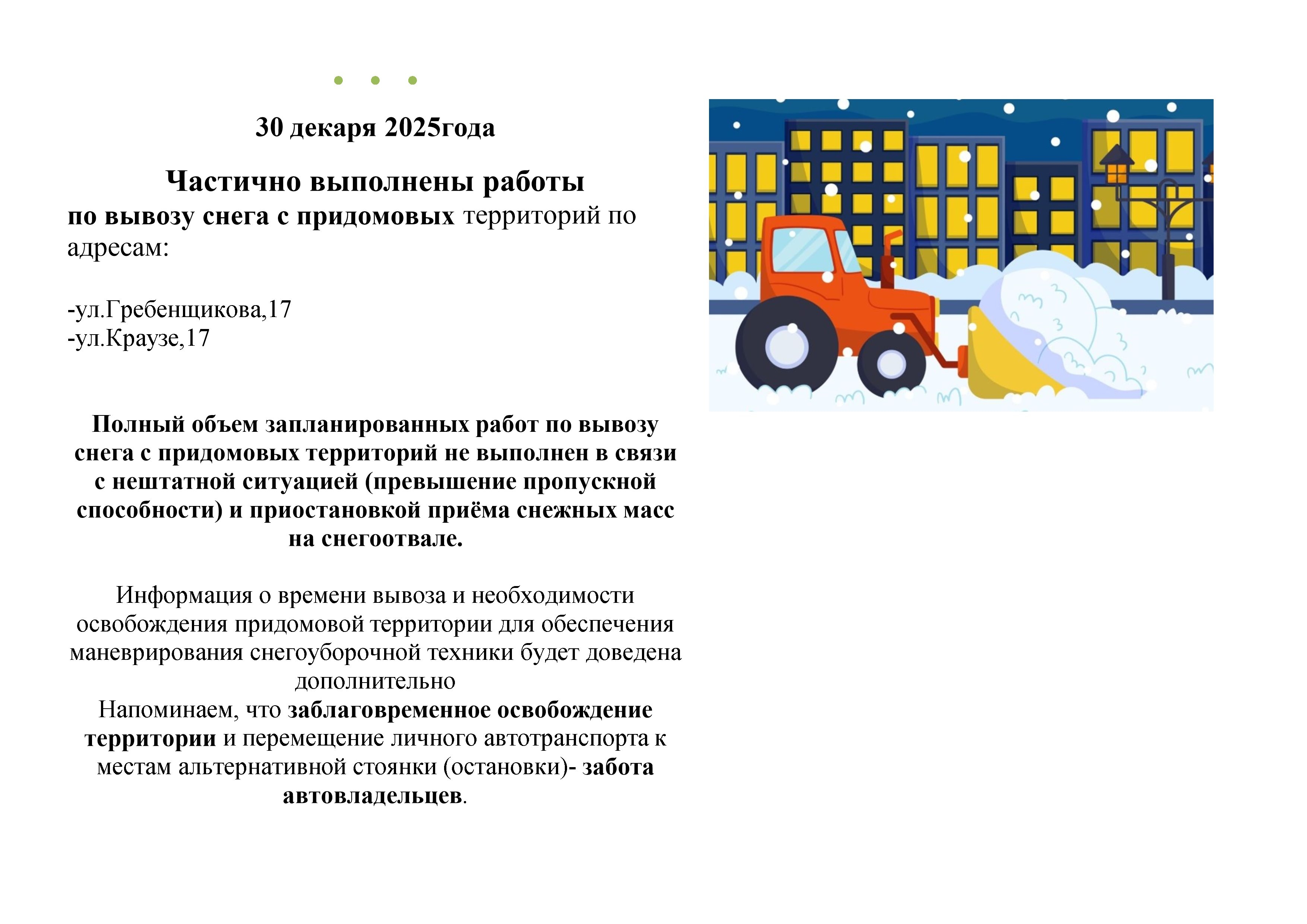 Обращаем внимание, что обеспечение оперативной работы снегоуборочной техники напрямую зависит от активности жителей.